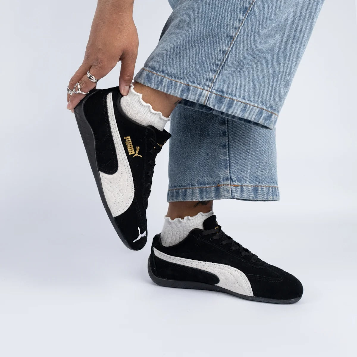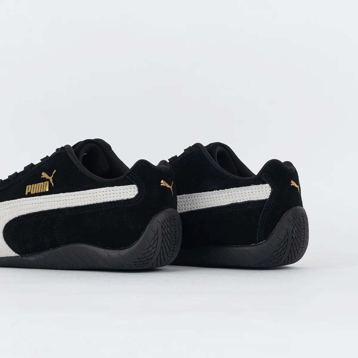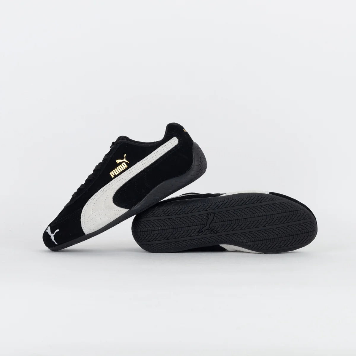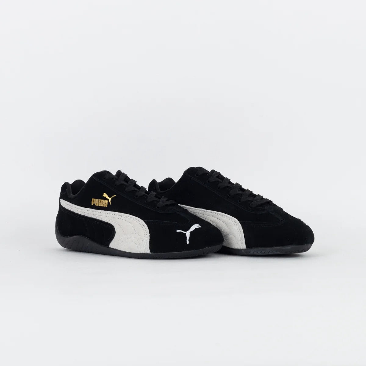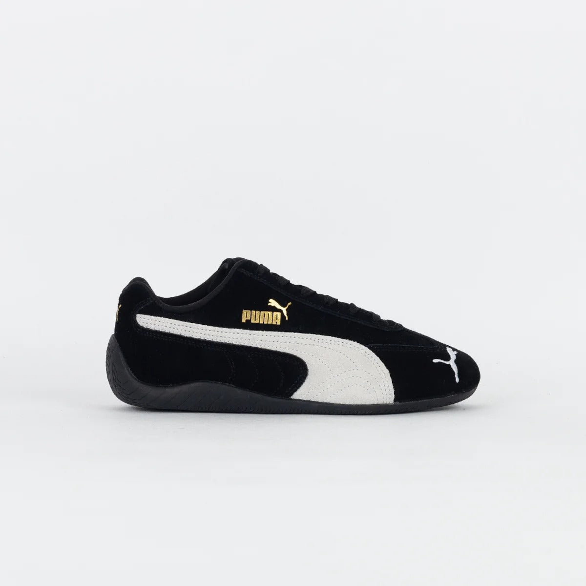 Inspired by Puma’s deep motorsport heritage, the Puma Speedcat LS - Black/White brings track-ready style to the streets. Built with a sleek black suede upper and contrasted by a bold white Formstrip, this low-profile sneaker embodies speed, precision, and control. Gold Puma branding on the side and tongue adds a premium finish, while the slim rubber outsole ensures grip and agility.